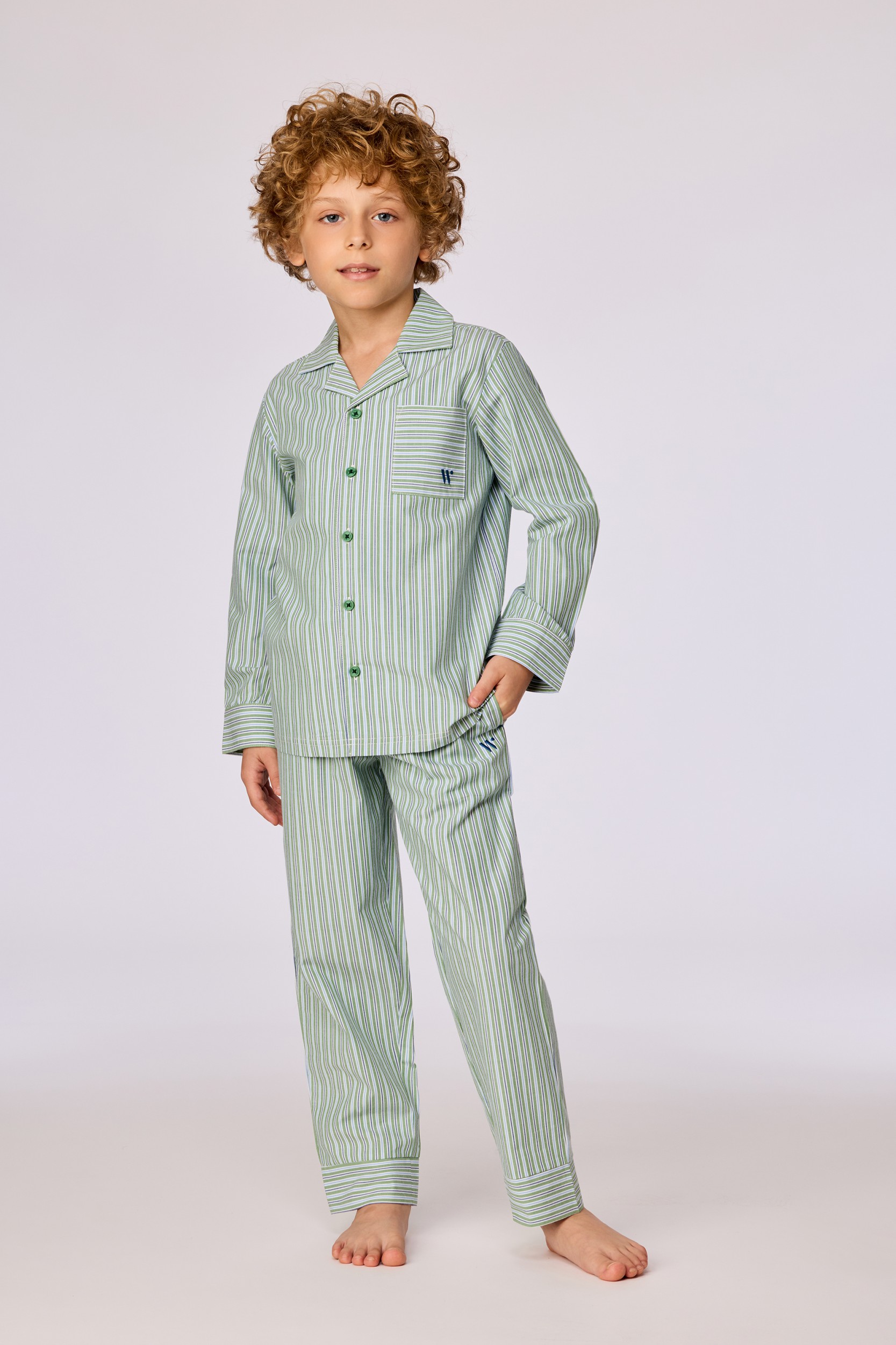 261-10-QWA-W/929Groene jongens en heren pyjama van geweven katoen. De pyjama bestaat uit een pyjamahemd met lange mouwen en een bijpassende lange broek. Het hemd is uitgevoerd met een omslagkraag, een volledige knoopsluiting aan de voorzijde en een borstzak. De borstzak is afgewerkt met een subtiel logo detail. De lange broek heeft een rechte pijp. De pyjama is uitgevoerd in een groen gestreept patroon dat zowel op het shirt als op de broek terugkomt. De manchetten van de mouwen en de broekspijpen zijn afgewerkt met een rechte zoom. Beschikbaar in de maten 4Y-XXL.