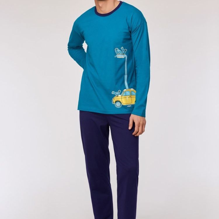 252-10-PLU-S/795Pyjama van 100% katoen. Het bovenstuk is groenblauw met een grote print in duiventhema. De broek is donkerblauw zoals de hals van de shirt. De pyjama is verkrijgbaar in de maten 24m/2y-XXL en heeft een schoudersluiting bij de maten 0-18m.