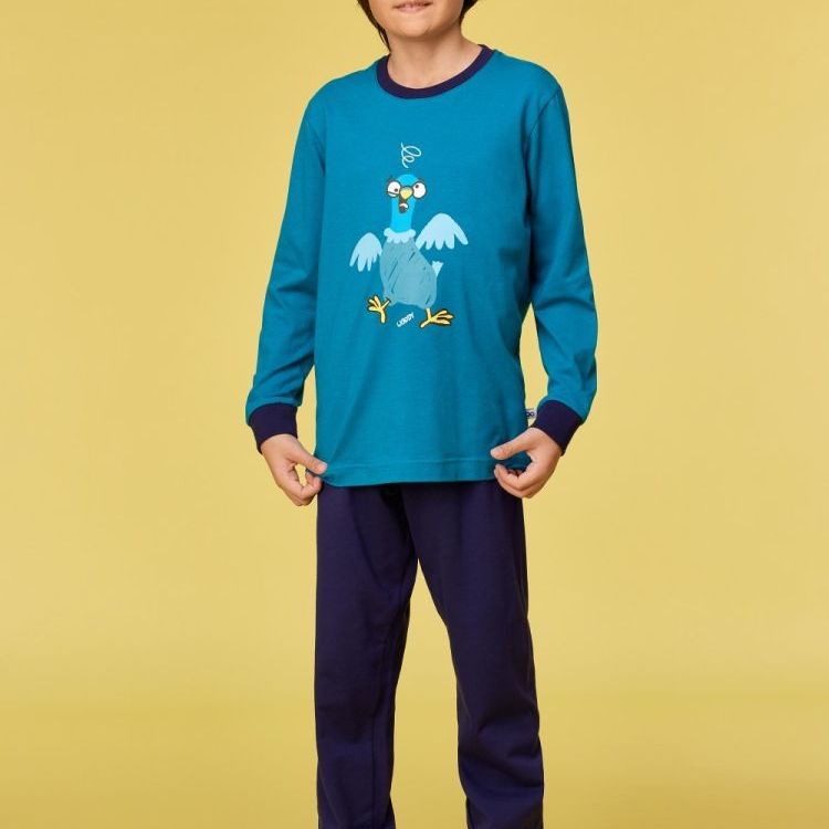 252-10-PLU-S/795Pyjama van 100% katoen. Het bovenstuk is groenblauw met een grote print in duiventhema. De broek is donkerblauw zoals de hals van de shirt. De pyjama is verkrijgbaar in de maten 24m/2y-XXL en heeft een schoudersluiting bij de maten 0-18m.