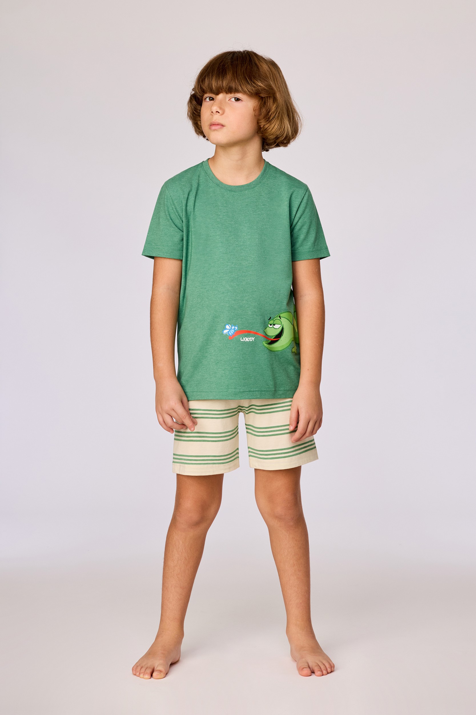 261-10-PSU-S/742Jongens en heren pyjama van soepel katoen. Het effen groene bovenstuk valt op door de grote vrolijke kameleonprint. Het bovenstuk wordt gecombineerd met een kleurrijk gestreepte short. Verkrijgbaar in de maten 3M-XXL.