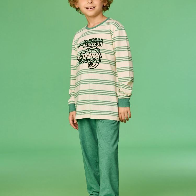261-10-PLC-S/909Tweedelige jongens en heren pyjamaset van soepel katoen. De T-shirt heeft een ronde hals, lange mouwen en een all over streeppatroon in contrasterende kleuren. Op de voorzijde is een grafische print geplaatst. De hals en manchetten zijn afgewerkt in een effen groene kleur. De broek heeft een lange pijp, een elastische tailleband en een rechte pasvorm. De broek is uitgevoerd in effen groen die aansluit bij de afwerking van de top. Beschikbaar in de maten 3m-XXL.
