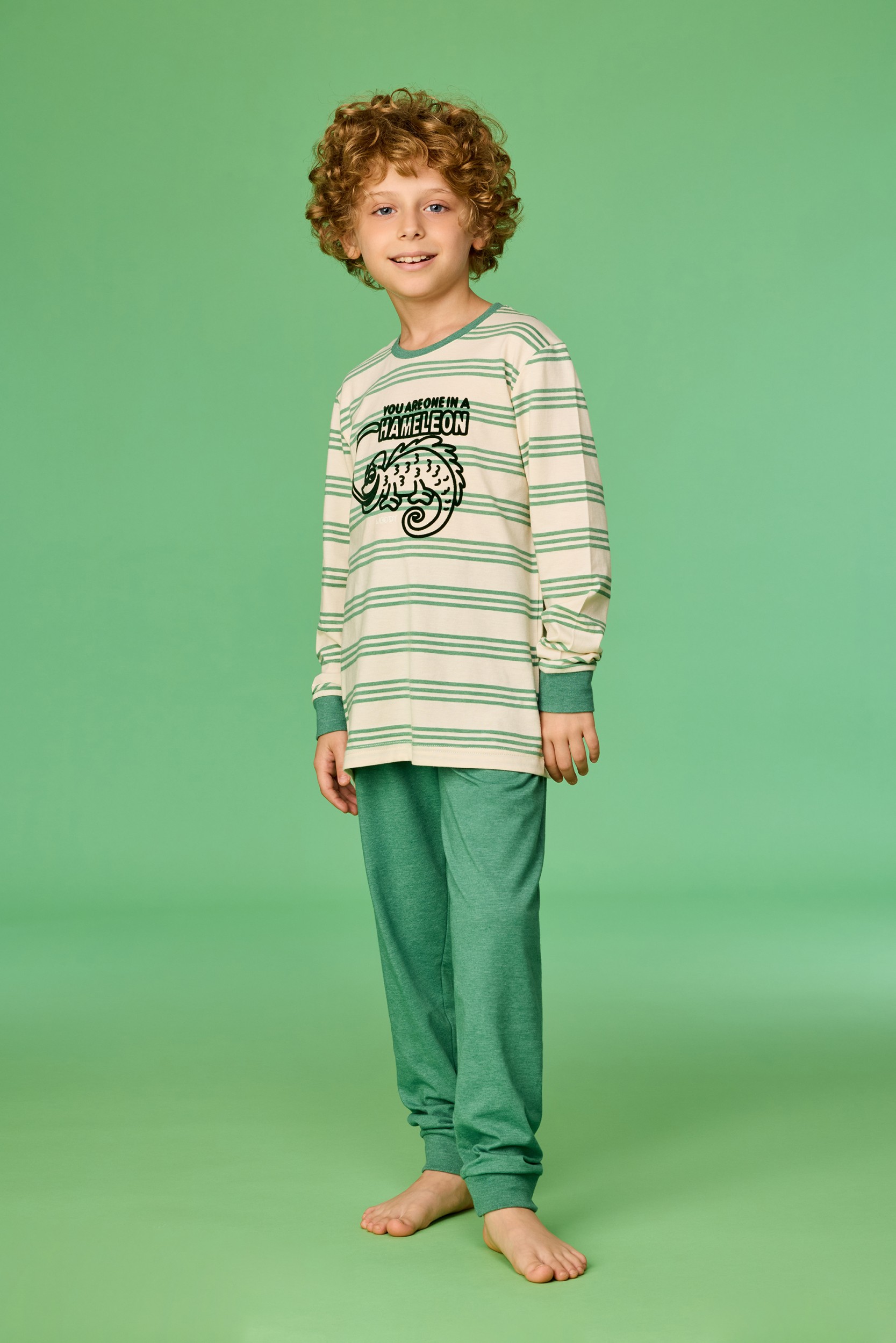 Tweedelige jongens en heren pyjamaset van soepel katoen. De T-shirt heeft een ronde hals, lange mouwen en een all over streeppatroon in contrasterende kleuren. Op de voorzijde is een grafische print geplaatst. De hals en manchetten zijn afgewerkt in een effen groene kleur. De broek heeft een lange pijp, een elastische tailleband en een rechte pasvorm. De broek is uitgevoerd in effen groen die aansluit bij de afwerking van de top. Beschikbaar in de maten 3m-XXL.