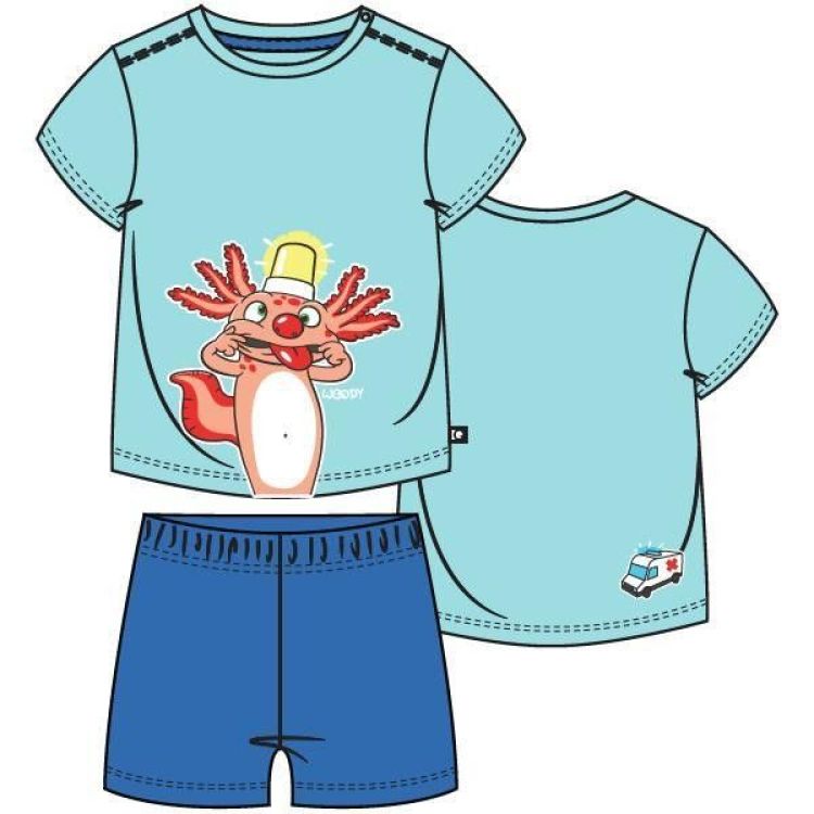 Tweedelige jongens en heren pyjamaset van soepel katoen. De T-shirt heeft een ronde hals, lange mouwen en een all over streeppatroon in contrasterende kleuren. Op de voorzijde is een grafische print geplaatst. De hals en manchetten zijn afgewerkt in een effen groene kleur. De broek heeft een lange pijp, een elastische tailleband en een rechte pasvorm. De broek is uitgevoerd in effen groen die aansluit bij de afwerking van de top. Beschikbaar in de maten 3m-XXL.