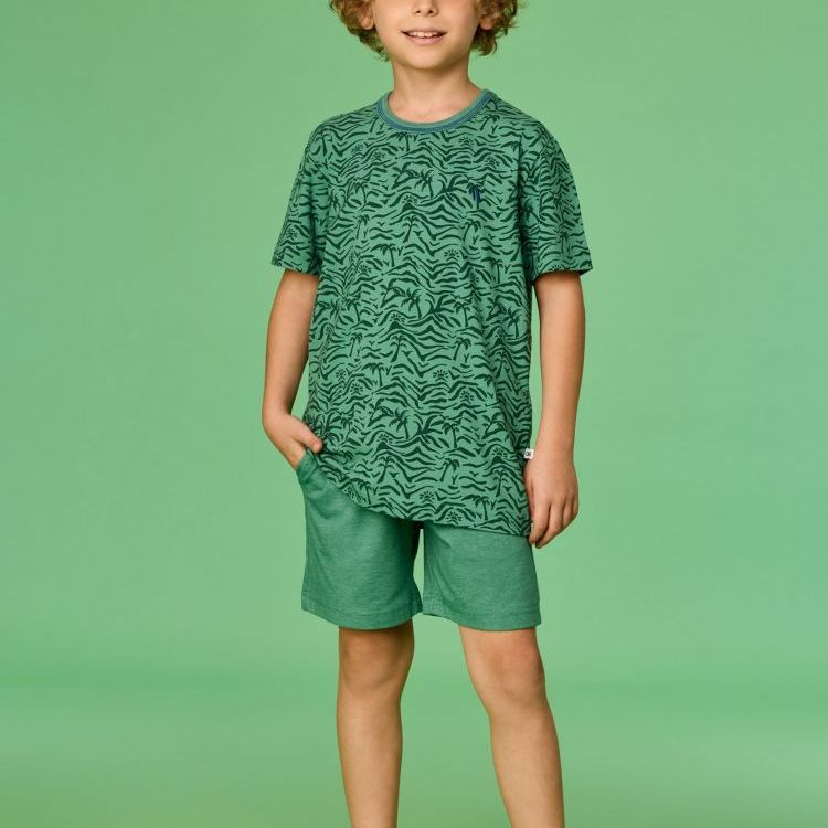 Jongens en heren pyjama bestaande uit een T-shirt en een bijpassende short van rekbaar en soepel katoen. Het T-shirt heeft korte mouwen, een ronde hals met contrasterende boord en een all over patroon van palmbomen in groentinten. Op de borst is een klein geborduurd logo aangebracht. De short is uitgevoerd in effen groen en heeft een elastische tailleband met een aantrekkoord en een rechte pijn. beschikbaar in de maten 2Y-XXL.