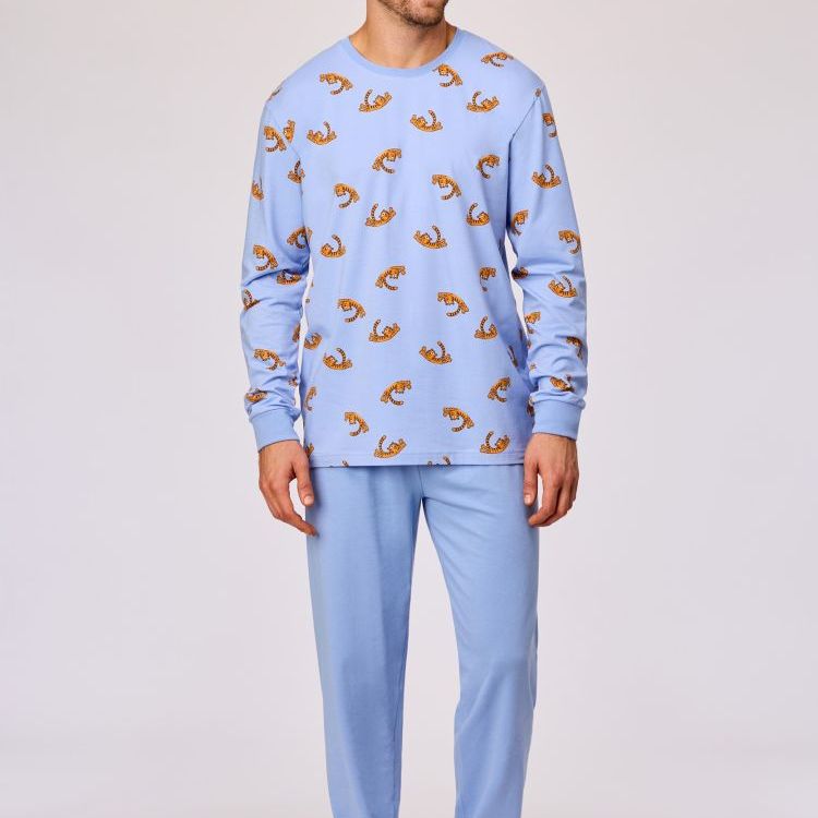 261-10-PUS-Z/887Jongens en heren pyjama van soepel katoen. Het effen donkerblauwe bovenstuk valt op door de grote vrolijke kameleonprint. Het bovenstuk wordt gecombineerd met een effen groene short. Verkrijgbaar in de maten 3M-XXL.