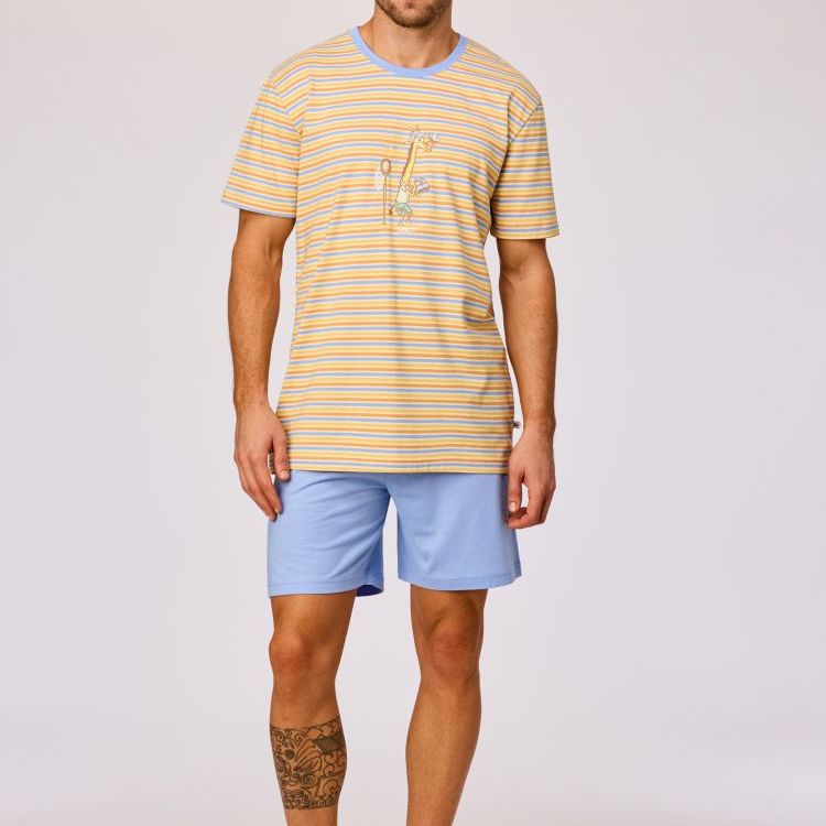 Jongens en heren pyjama van soepel katoen. Het gestreepte bovenstuk valt op door de grote vrolijke glow-in-the-dark dierenprint. Het bovenstuk wordt gecombineerd met een effen blauwe short. Verkrijgbaar in de maten 3M-XXL.