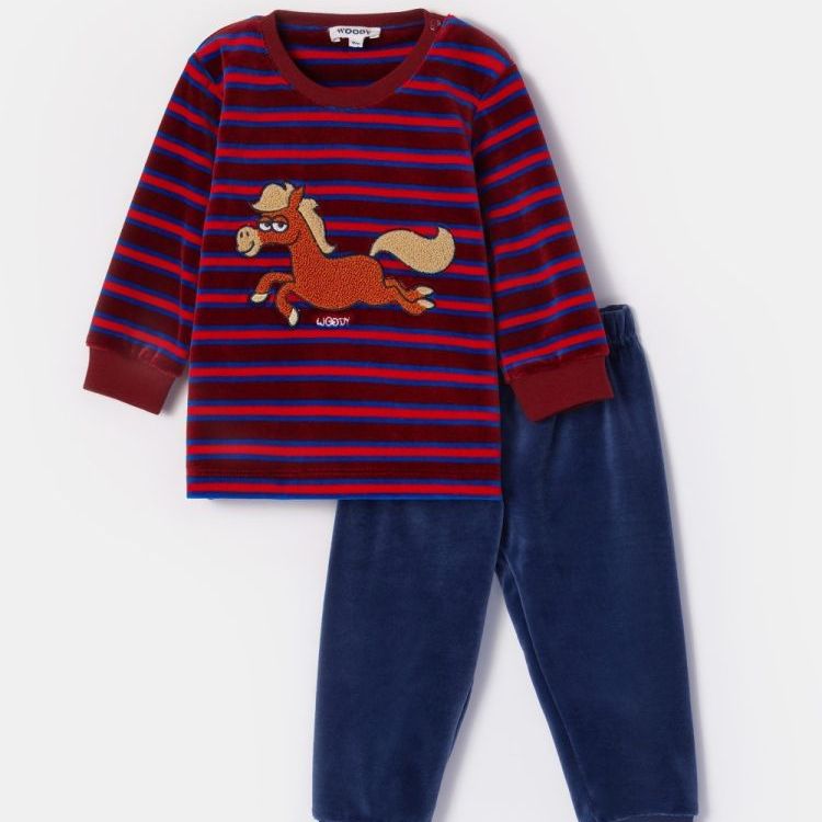 252-10-PLC-V/919Pyjama van velours met print van een pony. Het bovenstuk is rood-blauw gestreept. De mouwuiteinden, hals en pijpuiteinden zijn in de contrasterende kleur blauw. De broek is effen donkerblauw. De pyjama is verkrijgbaar in de maten 0m-XXL en heeft een schoudersluiting bij de maten 0-18m.