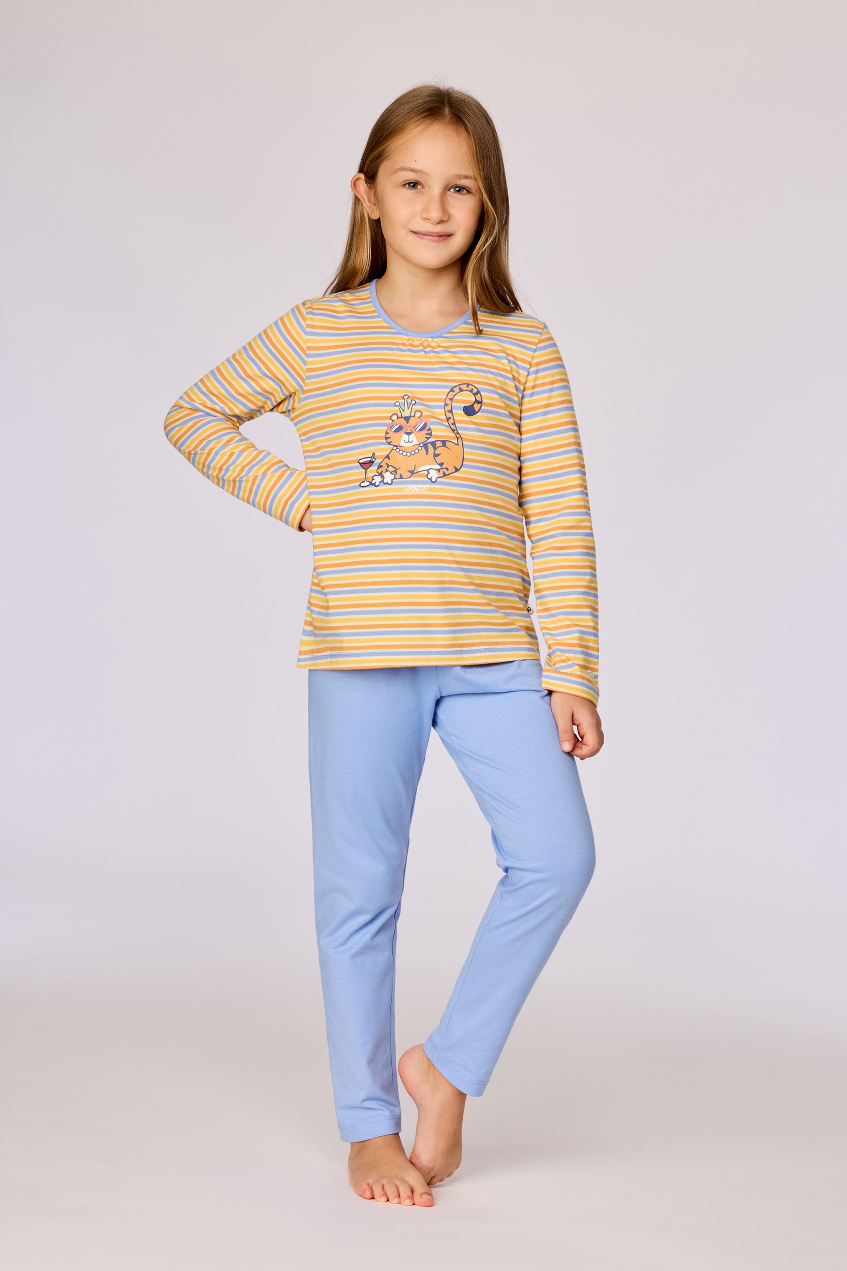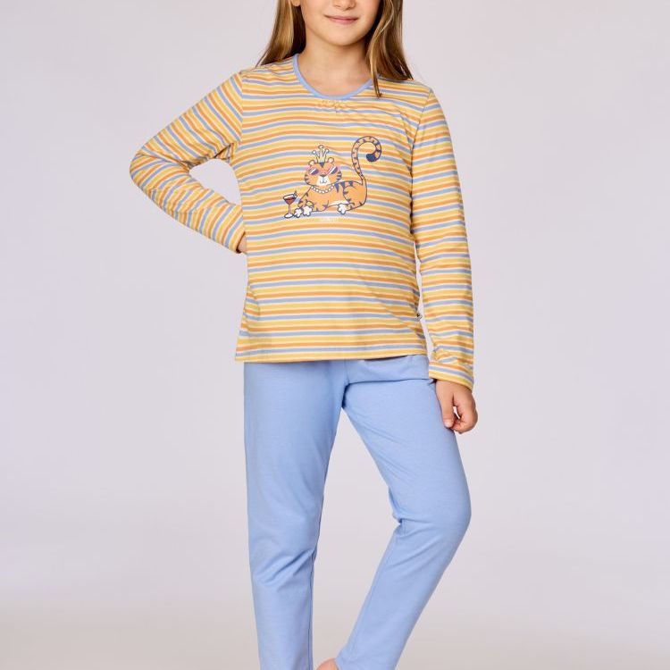 Tweedelige meisjes en dames pyjamaset van soepel katoen. Het gestreepte shirt heeft een tijgerprint en lange mouwen. Het bovenstuk wordt gecombineerd met een blauwe effen broek met elastische tailleband en een achterzak in hartjesvorm. Verkrijgbaar in maten 3M-XXL.