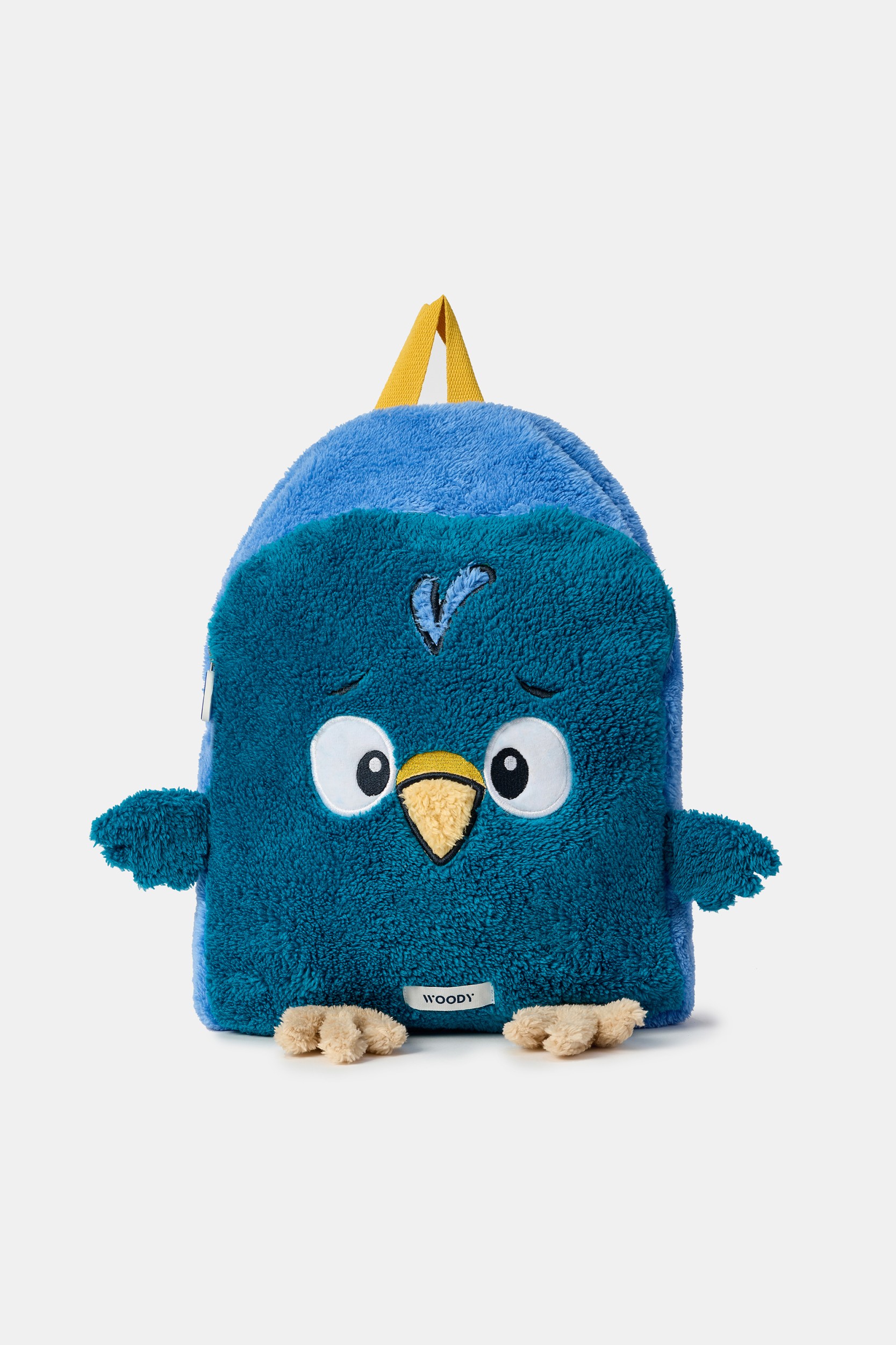 252-10-WBH-M/020Deze rugzak is gemaakt van blauwe teddystof en heeft een ontwerp in de vorm van een duif, met grote ogen en zachte vleugels. Het model is voorzien van een ritssluiting en verstelbare schouderriemen. Geschikt voor gebruik bij onder andere kinderopvang, school of logeerpartijen. Afmetingen: 34 x 28 cm.