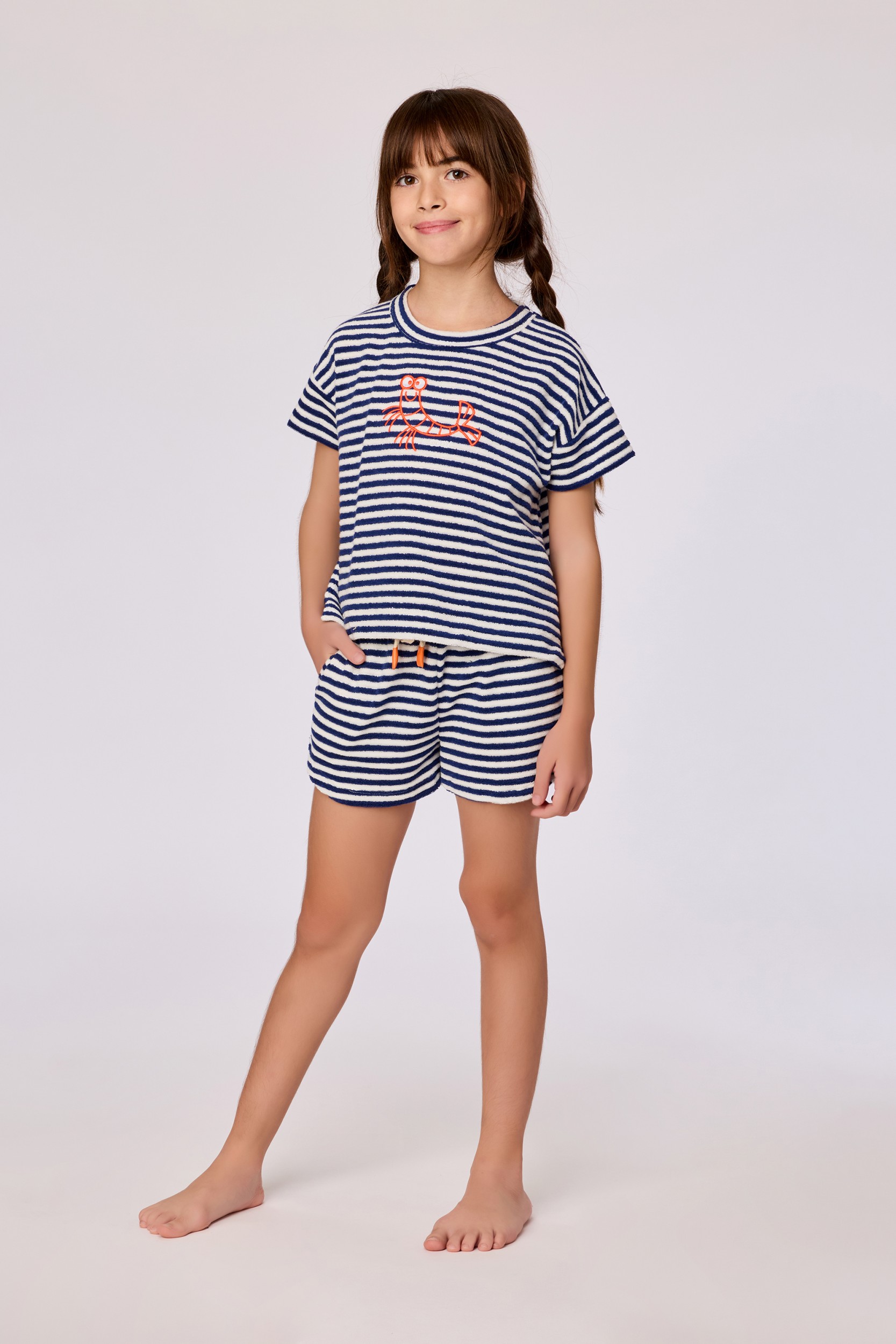 Tweedelige set voor meisjes en dames in Terry badstof. Het blauw-wit gestreepte bovenstuk heeft een kreeftenprint geborduurd en wordt gecombineerd met een gestreepte short, afgewerkt met een striklint. Verkrijgbaar in maten 2Y-XXL.