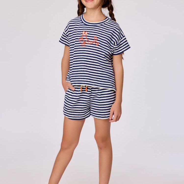 Tweedelige set voor meisjes en dames in Terry badstof. Het blauw-wit gestreepte bovenstuk heeft een kreeftenprint geborduurd en wordt gecombineerd met een gestreepte short, afgewerkt met een striklint. Verkrijgbaar in maten 2Y-XXL.