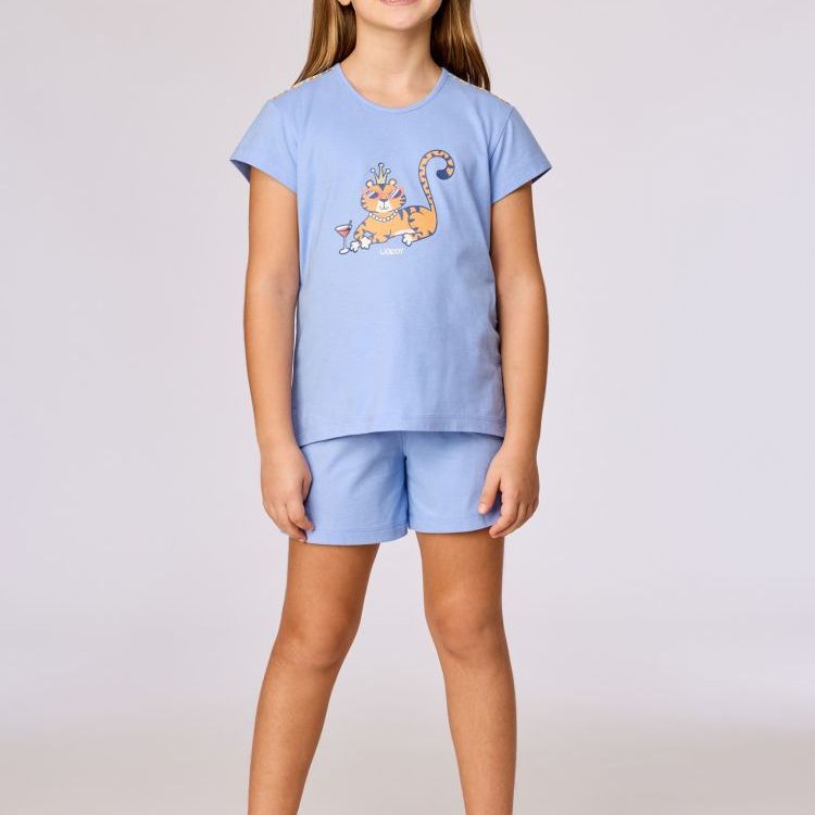 Deze blauwe pyjama van soepel katoen heeft een T-shirt met korte mouwen en een vrolijke print van een tijger met zonnebril. De schouders zijn afgewerkt met een kleurrijk detail dat mooi aansluit bij de print. De short heeft een comfortabele elastische taille en kleurrijke accenten langs de zijnaden. Dankzij de soepele katoenkwaliteit voelt deze pyjama licht en luchtig aan.