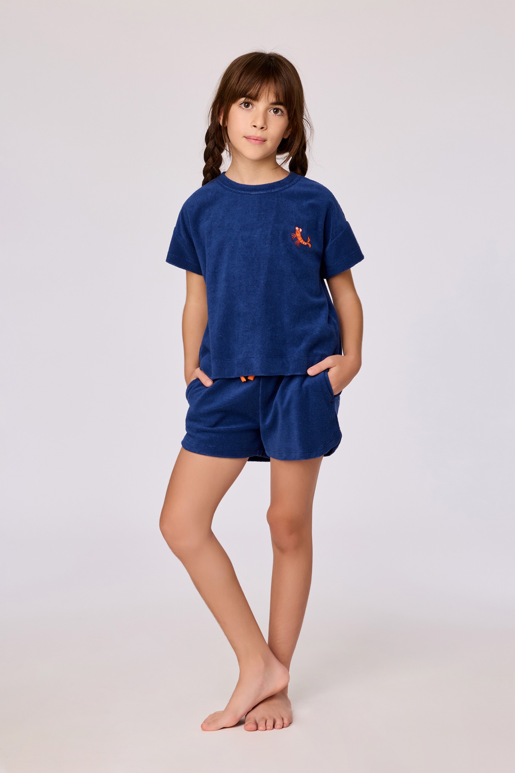 Tweedelige set voor meisjes en dames in Terry badstof. Het effen donkerblauwe bovenstuk heeft een kreeftenprint geborduurd en wordt gecombineerd met een effen short, afgewerkt met een striklint. Verkrijgbaar in maten 2Y-XXL.