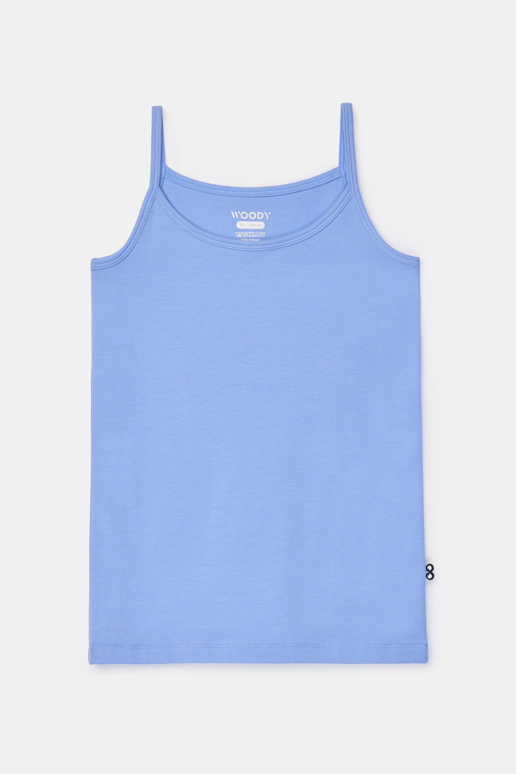Blauwe Woody singlet met spaghettibandjes voor meisjes in soepel en rekbaar katoen. Verkrijgbaar in maten 2Y-16Y.