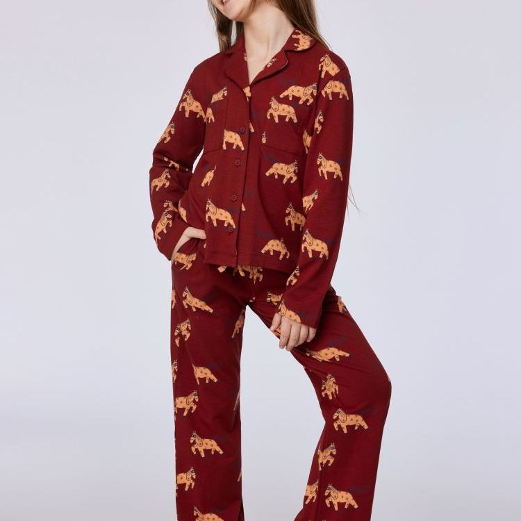 Donkerrode winterpyjama met ponyprint, gemaakt van soepel katoen. Dit doorknoopmodel heeft een losse pasvorm. Verkrijgbaar in de maten 6y-XXL.