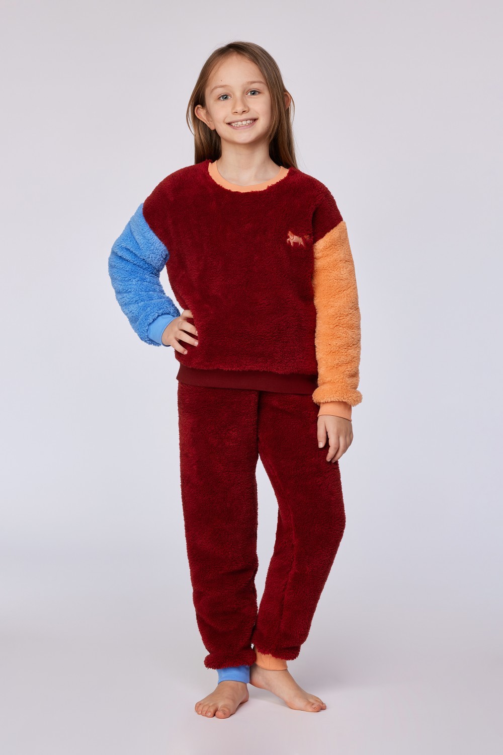 252-10-PYM-M/495Donkerrode set van teddystof. De set bestaat uit een sweatertrui en broek met rekker. De sweater met kleine ponyprint heeft twee contrasterende mouwen oranje en blauw, net zoals de pijpuiteinden van de broek. De set is verkrijgbaar in de maten 6m-XXL.