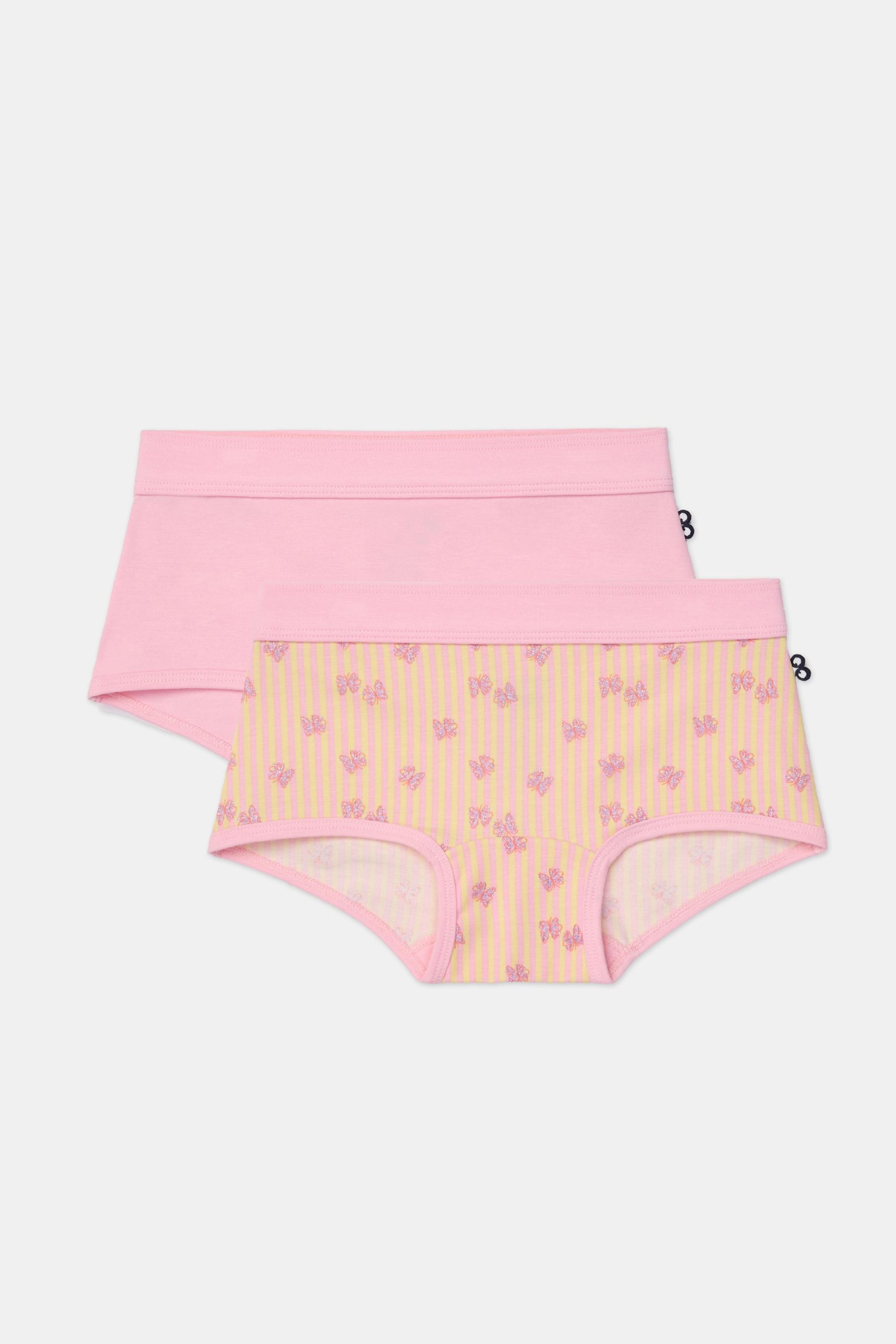Set van 2 shorty onderbroeken van rekbaar en soepel katoen. Het duopack bestaat uit een effen roze shorty en een zacht gele shorty met vlinderprint. Verkrijgbaar in maten 2Y-16Y.