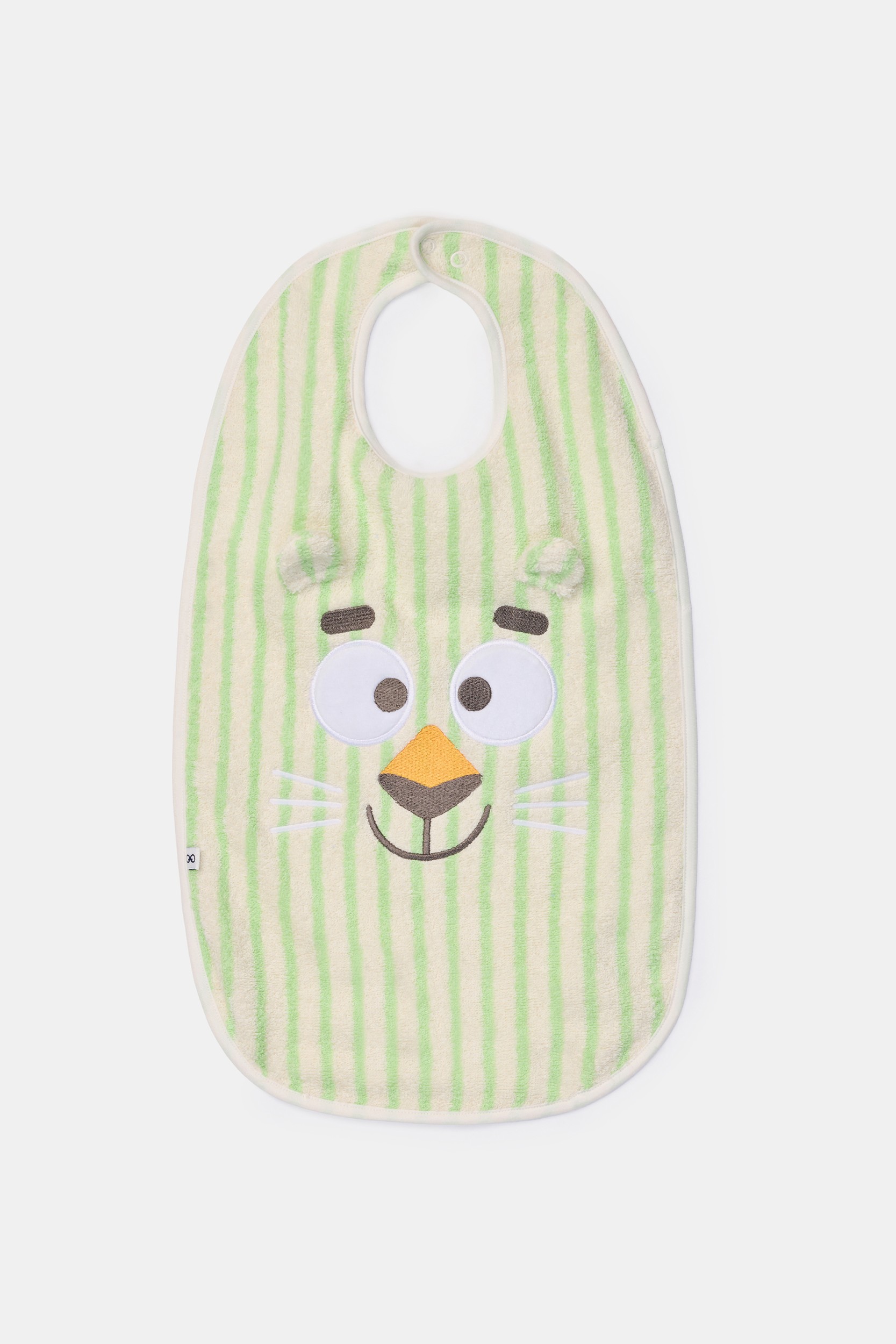 261-10-BIM-B/919Groot groen-wit gestreept slabbetje van badstof met kattenprint. Deze praktische slab sluit door middel van 2 drukknopen (2 verschillende standen mogelijk). Perfect voor dagelijks gebruik. Formaat 30 x 45cm.