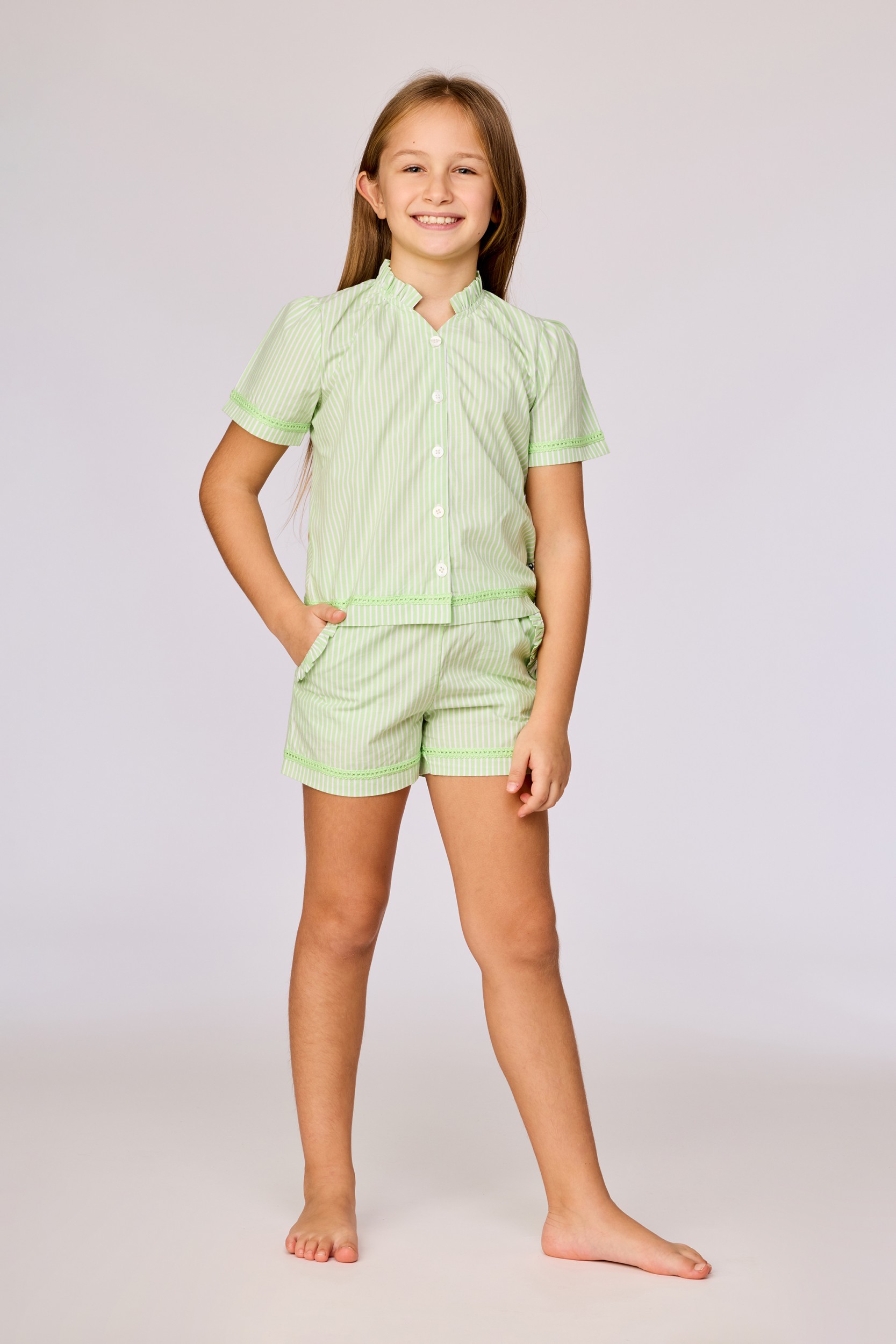 261-10-WPJ-W/928Deze groen-wit gestreepte doorknooppyjama heeft korte mouwen en een gefronste V-hals. De fijne verticale strepen geven de pyjama een klassieke en tegelijk moderne uitstraling, terwijl de frisgroene sierstiksels een speels accent toevoegen. De bijpassende short heeft een elastische taille en handige zakjes met ruche detail. Beschikbaar in maten 2Y - XXL.