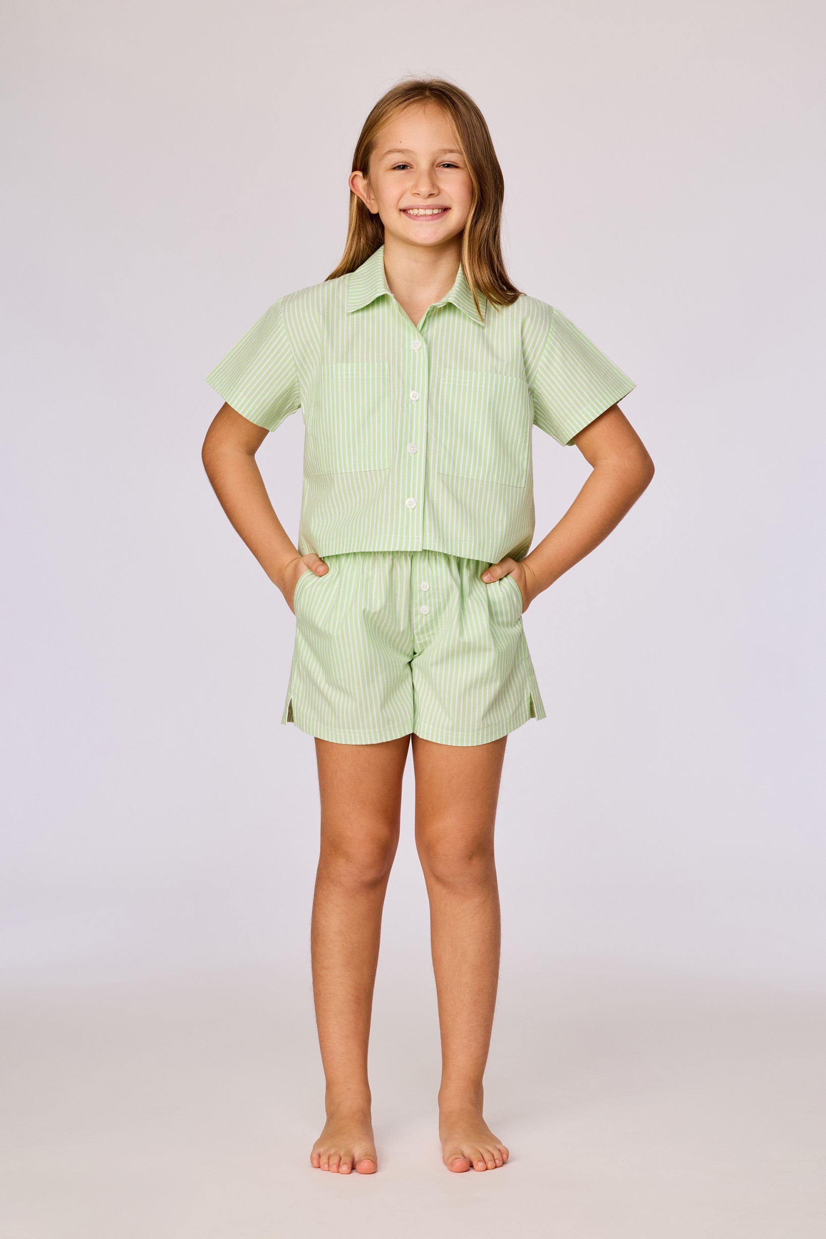 Deze groen-wit gestreepte doorknooppyjama heeft korte mouwen en een klassieke kraag. De fijne verticale strepen geven de pyjama een klassieke en tegelijk moderne uitstraling. De bijpassende short heeft een elastische taille en handige zakjes. Beschikbaar in maten 2Y - XXL.