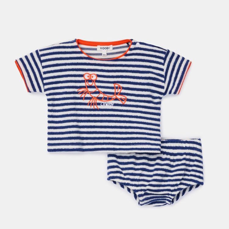 Tweedelige groen-wit gestreepte set voor baby's en peuters in Terry badstof met contrastbies. Het gestreepte bovenstuk heeft een kleine walvisprint geborduurd, sluit aan de schouder met drukknopen en wordt gecombineerd met een gestreept bloomer broekje. Verkrijgbaar in maten 3M-2Y.