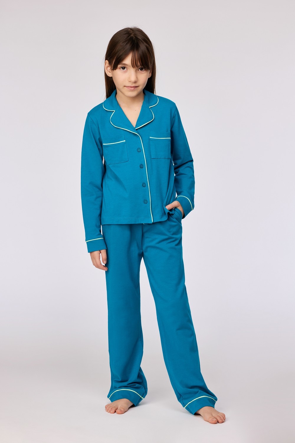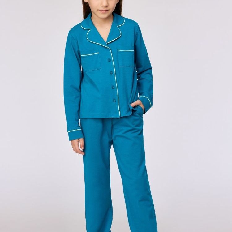 Groenblauwe winterpyjama, gemaakt van soepel katoen. Dit doorknoopmodel heeft een losse pasvorm. Verkrijgbaar in de maten 6y-XXL.