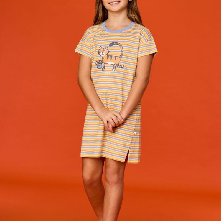 261-10-BST-S/905Kleurrijk gestreepte pyjama voor meisjes en dames van soepel katoen. Het gestreepte bovenstuk heeft korte mouwen en een grote kat als print. De pyjama wordt gecombineerd met een blauwe effen short. Verkrijgbaar in maten 3M-XXL.