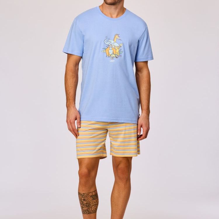 Tweedelige meisjes en dames pyjamaset van soepel katoen. Het gele gestreepte shirt heeft een vlinderprint en lange mouwen. Het bovenstuk wordt gecombineerd met een lila effen broek met elastische tailleband en een achterzak in hartjesvorm. Verkrijgbaar in maten 3M-XXL.
