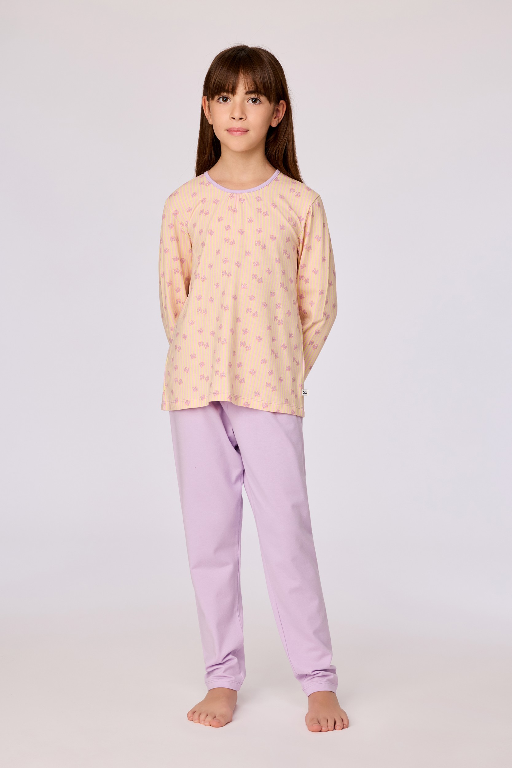261-10-PLG-Z/903Tweedelige meisjes en dames pyjamaset van soepel katoen. Het gele gestreepte shirt heeft een vlinderprint en lange mouwen. Het bovenstuk wordt gecombineerd met een lila effen broek met elastische tailleband en een achterzak in hartjesvorm. Verkrijgbaar in maten 3M-XXL.