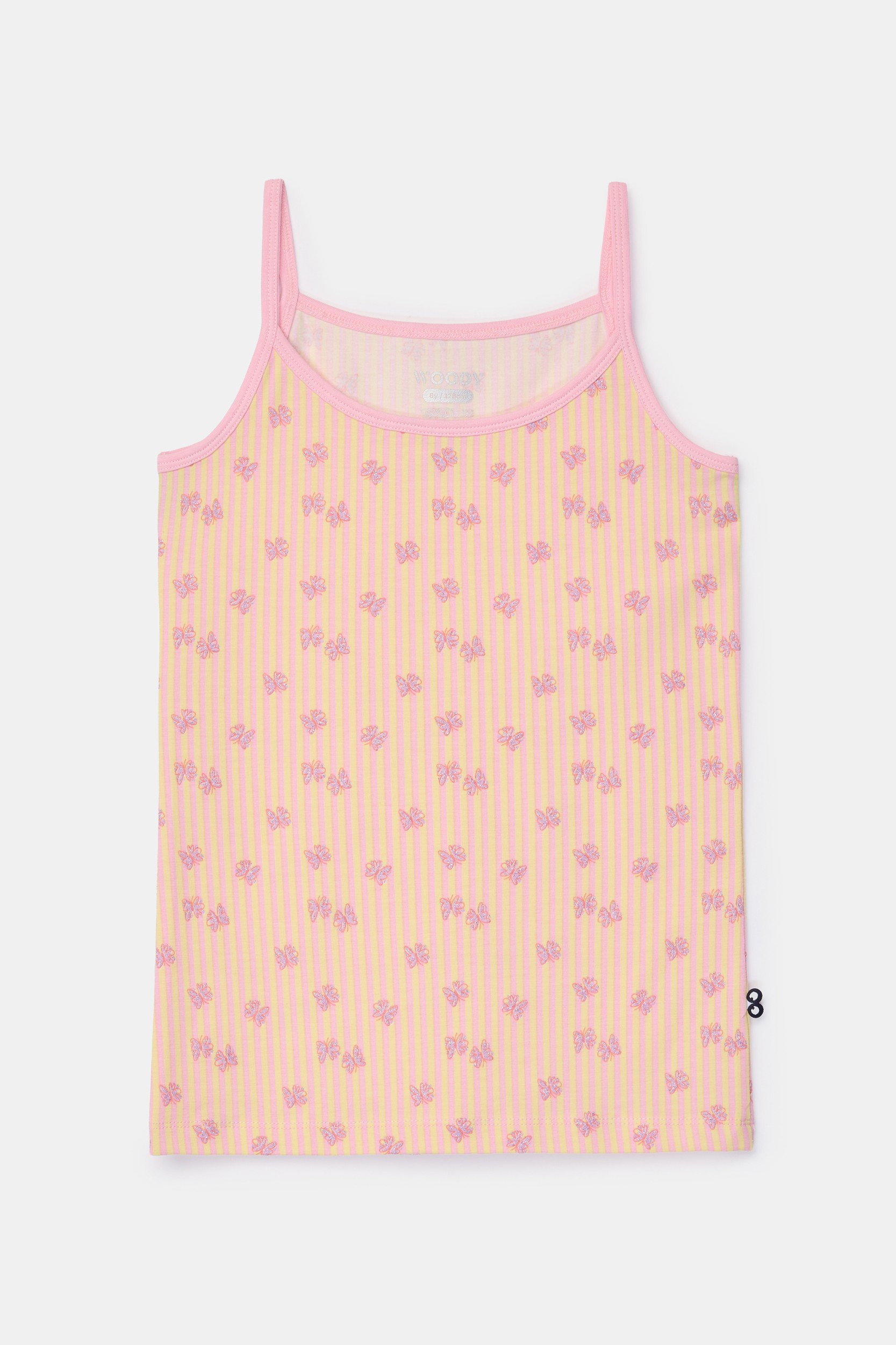 Zacht gele-roze Woody singlet met vlinderprint en spaghettibandjes voor meisjes in soepel en rekbaar katoen. Verkrijgbaar in maten 2Y-16Y.