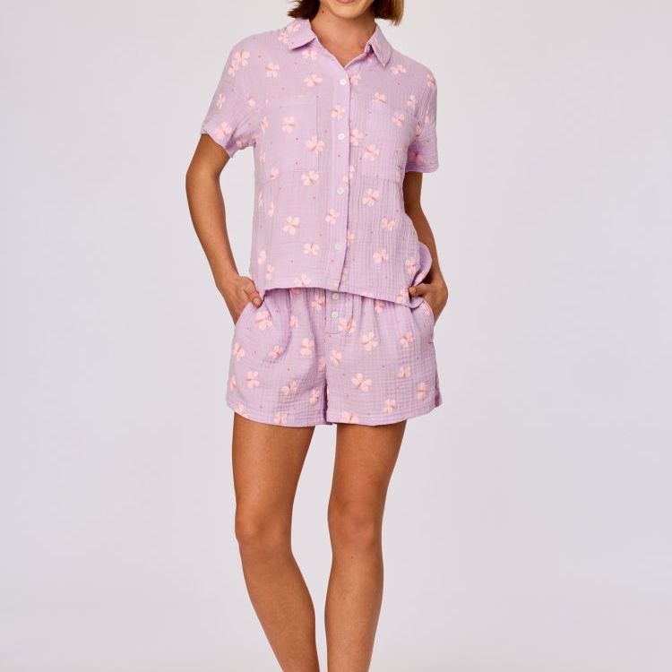 Deze lila doorknooppyjama heeft korte mouwen en een klassieke kraag. De allover print met vlinders geeft de pyjama een speelse uitstraling. De bijpassende short heeft een comfortabele elastische taille en voelt dankzij de tetrastof licht aan op de huid. Beschikbaar in maten 2Y - XXL.