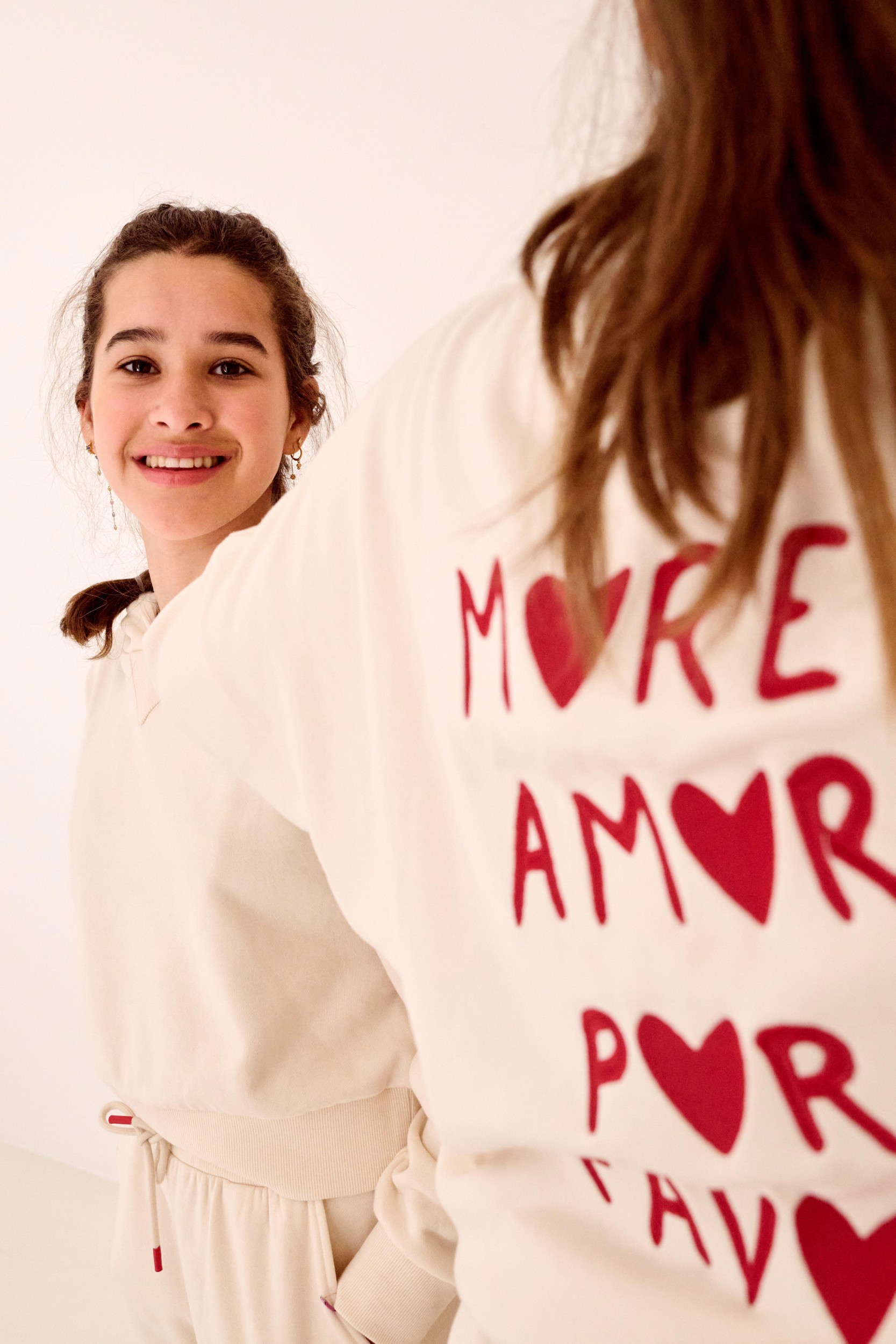 253-18-WKI-K/110Ecru oversized sweater van joggingstof. De sweater heeft de tekst 'More Amor Por Favor' op de achterkant. Verkrijgbaar in de maten 12y-XXL. Uit de Woody & Kirilove collectie: een unieke samenwerking waarin de kwaliteit en het comfort van Woody wordt gecombineerd met de fashionable touch van Yelena en Eloise, de dochters van Tiany Kirilove.