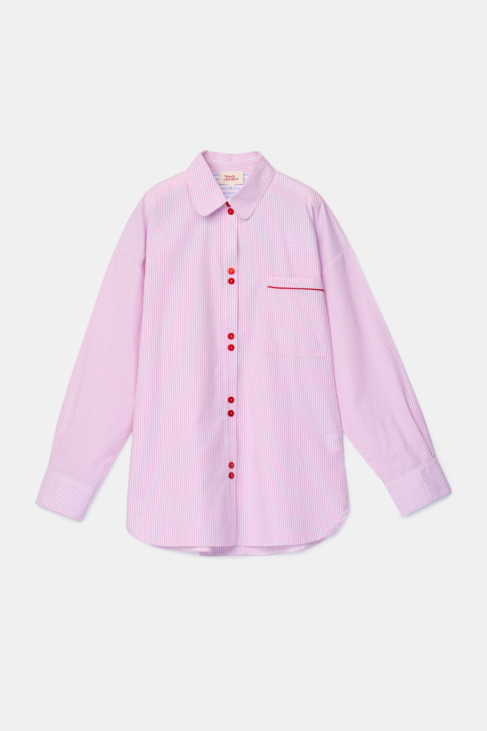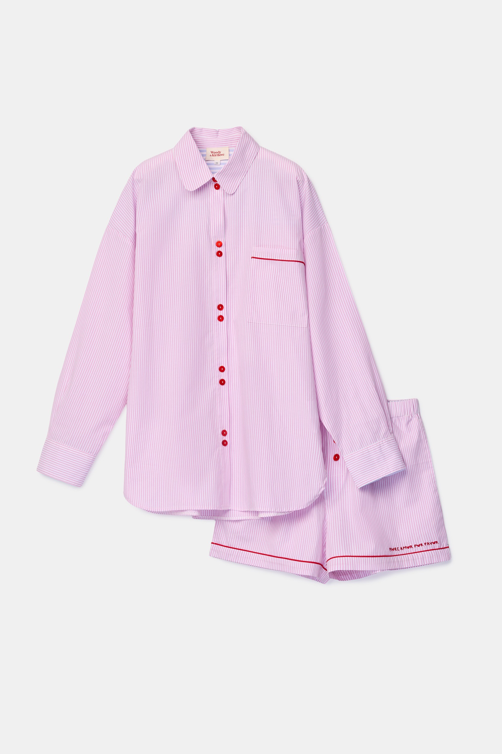 Pyjama met roze en wit streepjespatroon, gemaakt van luchtige hemdstof. Het doorknoopmodel met rode knopen heeft een losse pasvorm en een korte broek met de geborduurde rode tekst more amore por favor. Verkrijgbaar in de maten 12y–XXL. Uit de Woody & Kirilove collectie: een unieke samenwerking waarin de kwaliteit en het comfort van Woody wordt gecombineerd met de fashionable touch van Yelena en Eloise, de dochters van Tiany Kirilove.