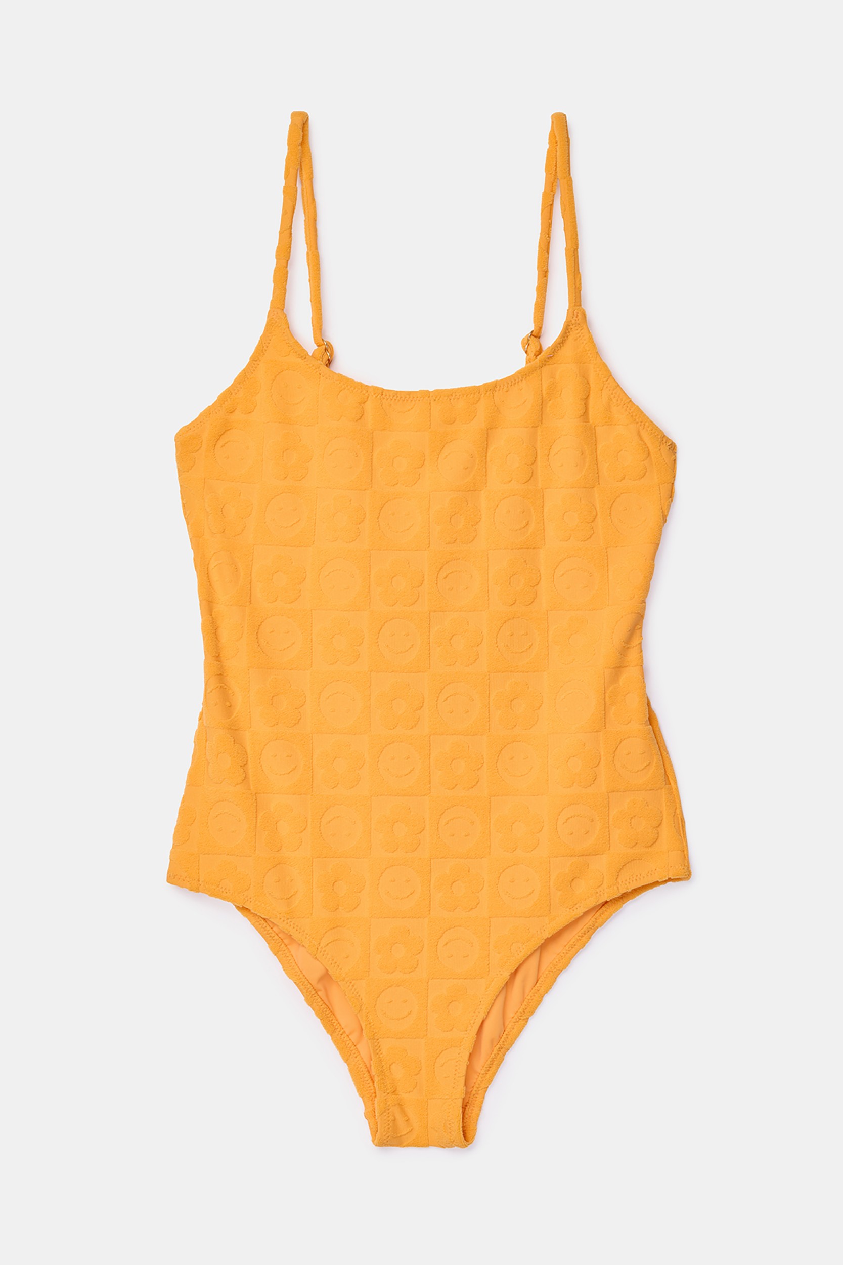 261-10-YAA-A/505Dit eendelige badpak is uitgevoerd in een oranje stof met reliëfmotief. Het model heeft een rechte halslijn en verstelbare schouderbandjes. De binnenzijde is volledig gevoerd in een effen stof. Het badpak is zowel verkrijgbaar voor meisjes als dames. Verkrijgbaar in maten 2Y-L.