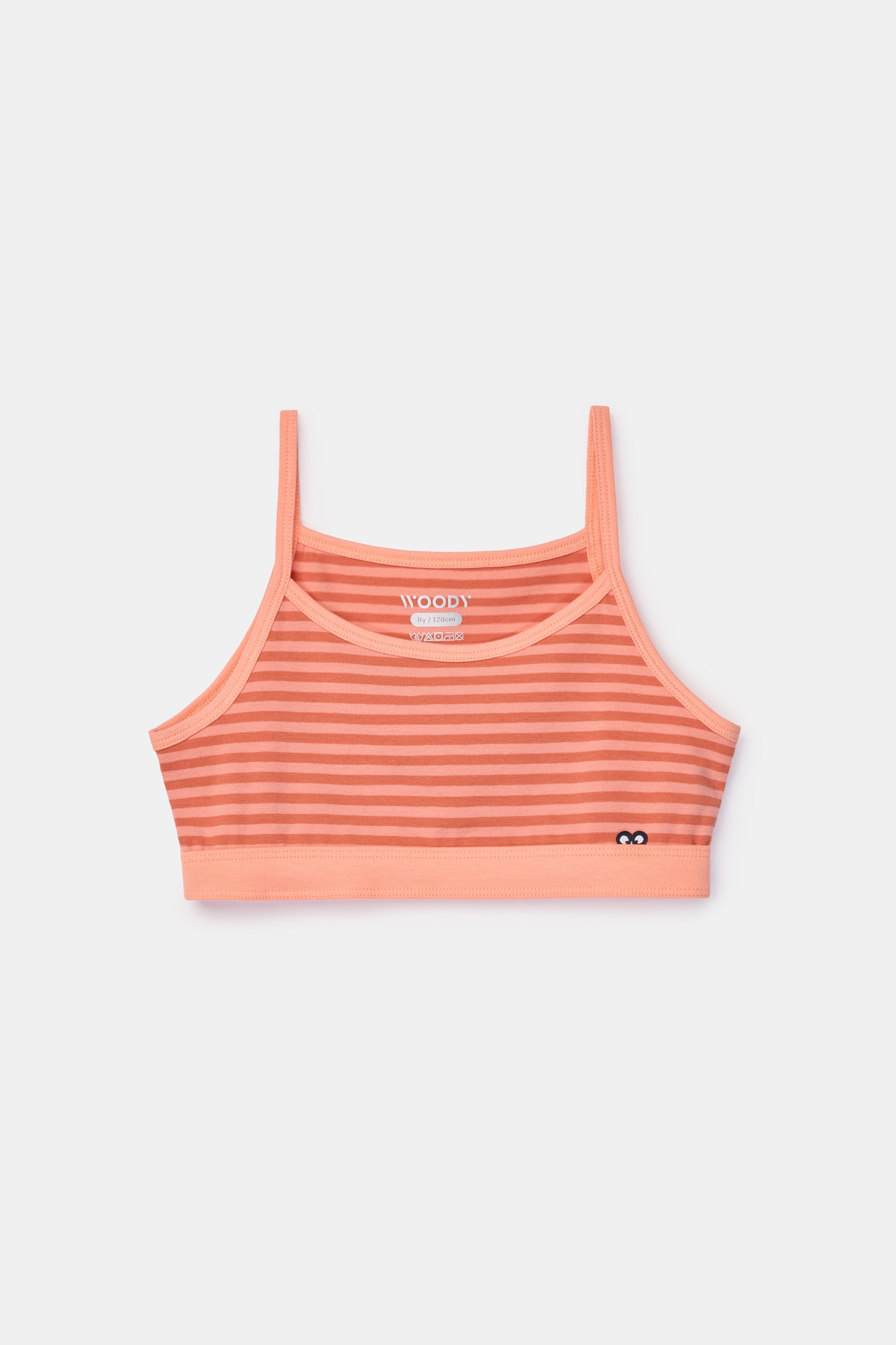 261-10-SPT-Z/902Oranje - roze gestreept kort topje van rekbaar katoen. Het topje heeft spaghettibandjes, is afgewerkt met een stretch boord onderaan. Verkrijgbaar in maten 2Y-16Y.