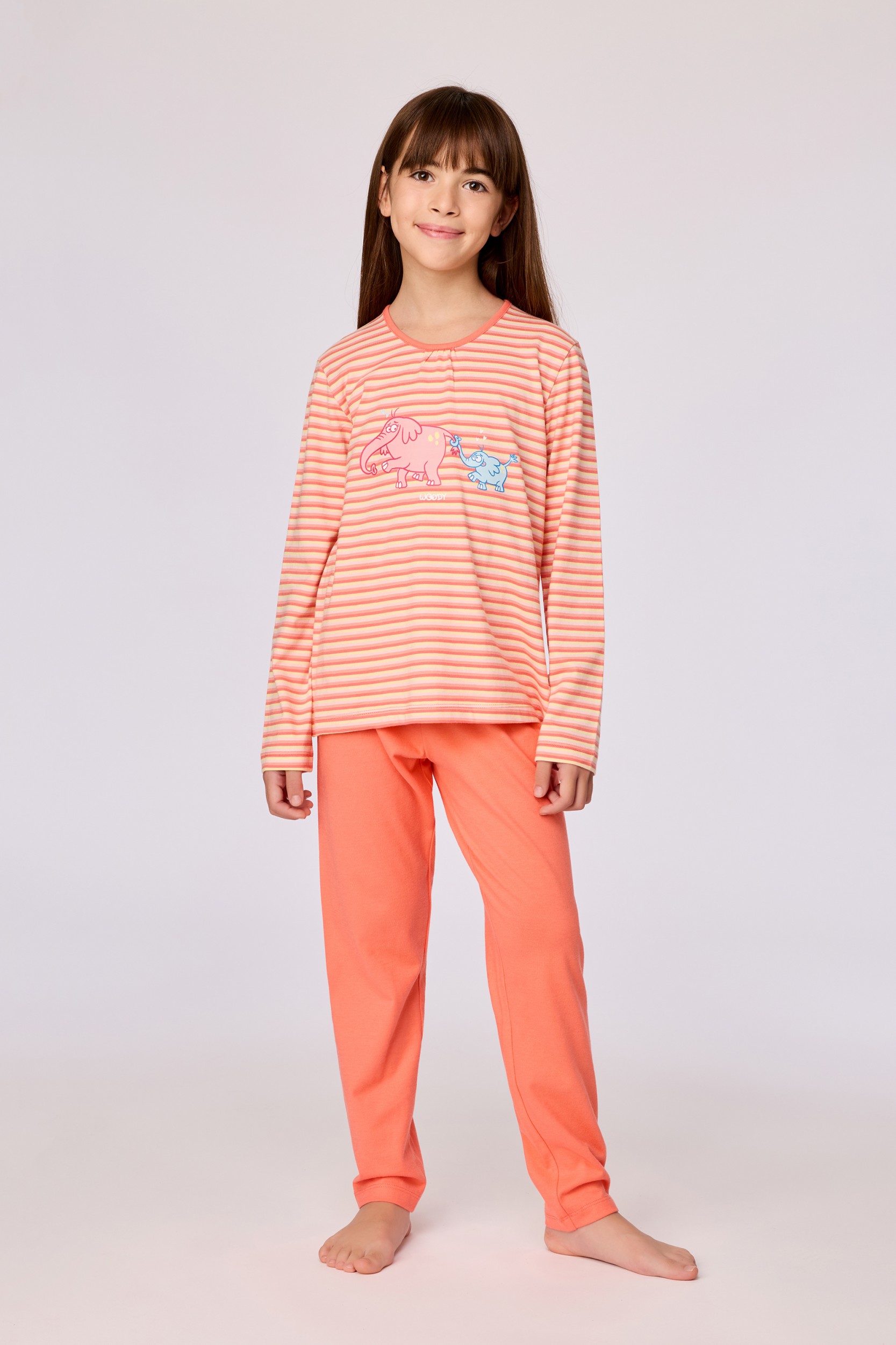 Tweedelige meisjes en dames pyjamaset van soepel katoen. Het roos-oranje gestreepte shirt heeft een olifantenprint en lange mouwen. Het bovenstuk wordt gecombineerd met een oranje effen broek met elastische tailleband en een achterzak in hartjesvorm. Verkrijgbaar in maten 3M-XXL.