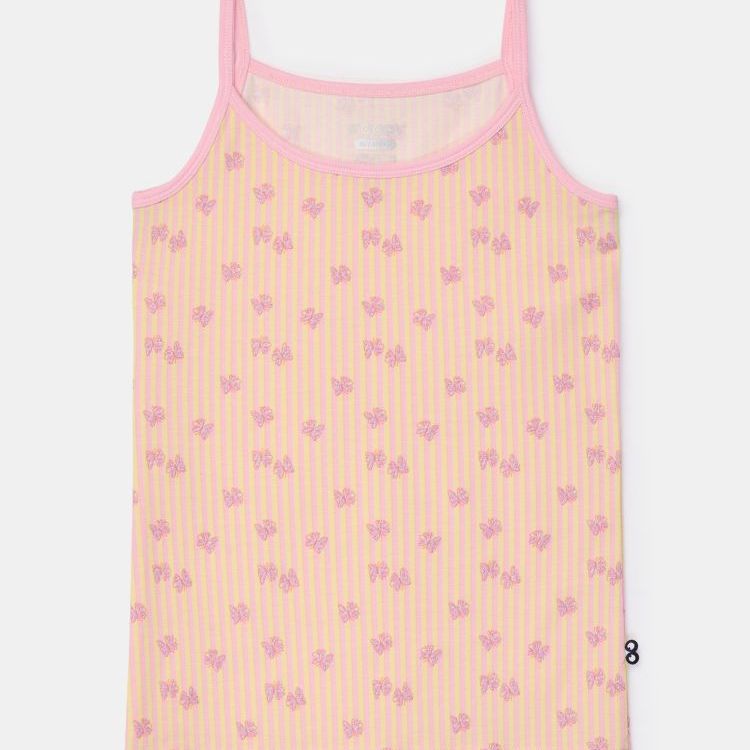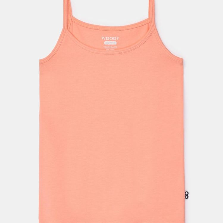 Perzikoranje Woody singlet met spaghettibandjes voor meisjes in soepel en rekbaar katoen. Verkrijgbaar in maten 2Y-16Y.