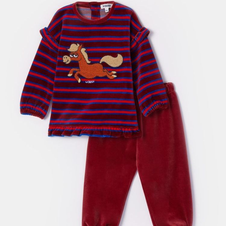 252-10-PDL-V/919Rode pyjama van velours. Het bovenstuk is gestreept, heeft een grote pony print op de borst, een fantasie aan de mouwen en onderkant. De broek is effen donkerrood. Verkrijgbaar in de maten 0m-XXL. Voor de maten 0m-8y is er een sluiting in de rug voorzien.