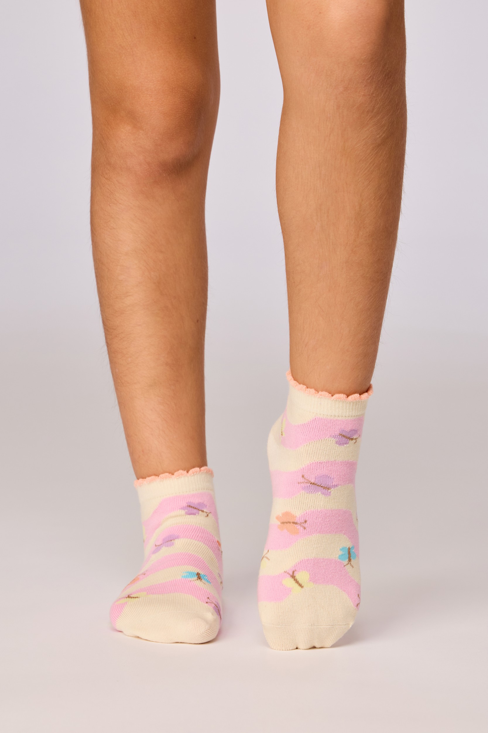 Kleurrijke set van twee paar korte sokken van fijn katoen. Beide sokken hebben een vlinderprint. Verkrijgbaar in de maten 0-6m tot 43-46.