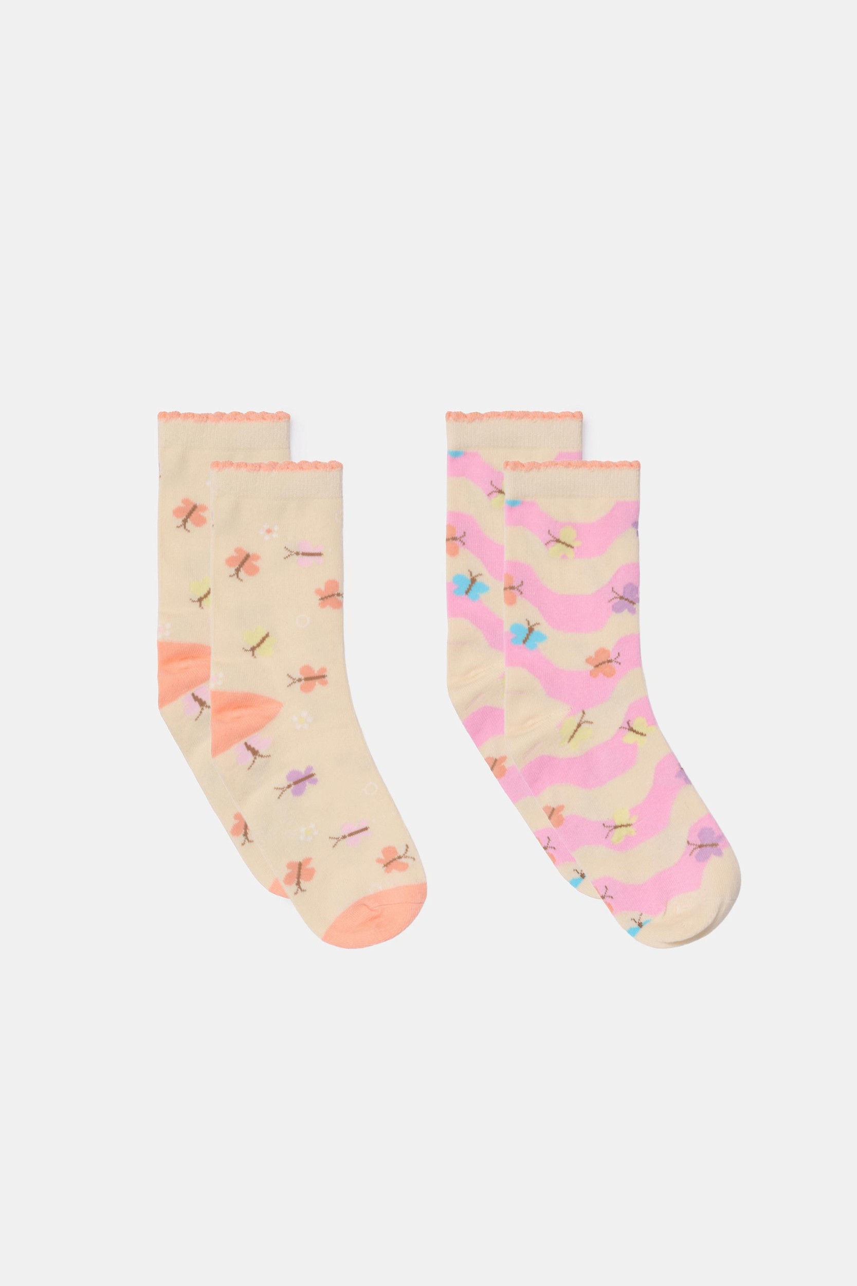 261-10-SOL-I/040Kleurrijke set van twee paar sokken van fijn katoen. Beide sokken hebben een vlinderprint. Verkrijgbaar in de maten 0-6m tot 43-46.