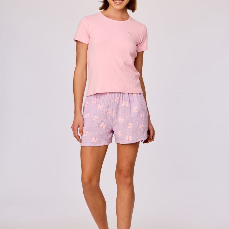 261-10-WPK-W/106Deze pyjama bestaat uit een gebroken witte T-shirt en een gestreepte short. Het T shirt heeft een ronde hals, korte mouwen en een rechte pasvorm. Op de borst bevindt zich een subtiel ton sur ton logo. De short is uitgevoerd met een elastische tailleband en heeft een recht, los silhouet. Het shortje is voorzien van een fijn verticaal streeppatroon en een klein geborduurd detail aan de voorzijde. Beschikbaar in de maten 2Y-XXL.