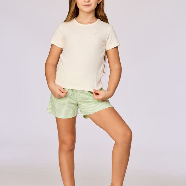 Deze pyjama bestaat uit een gebroken witte T-shirt en een gestreepte short. Het T shirt heeft een ronde hals, korte mouwen en een rechte pasvorm. Op de borst bevindt zich een subtiel ton sur ton logo. De short is uitgevoerd met een elastische tailleband en heeft een recht, los silhouet. Het shortje is voorzien van een fijn verticaal streeppatroon en een klein geborduurd detail aan de voorzijde. Beschikbaar in de maten 2Y-XXL.
