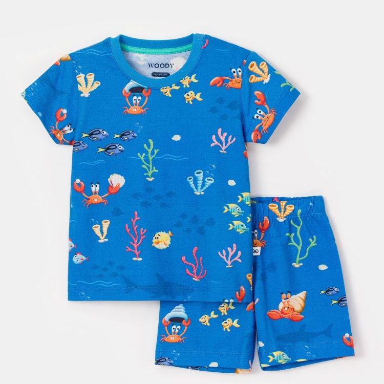 Jongens en heren shorty pyjama van soepel katoen. Het shirt staat volledig in het thema van onze Woody heremietkreeft : niet alleen vooraan staat er een grote mooie print, maar ook achteraan , en deze lichten op in het donker ! Dit wordt gecombineerd met een shortje. Ideaal voor zalige dromen van verre vakanties. Verkrijgbaar voor alle jongens van 0 maand tem maat XXL. In de maatjes 0m tot 18m is er een schoudersluiting voorzien.